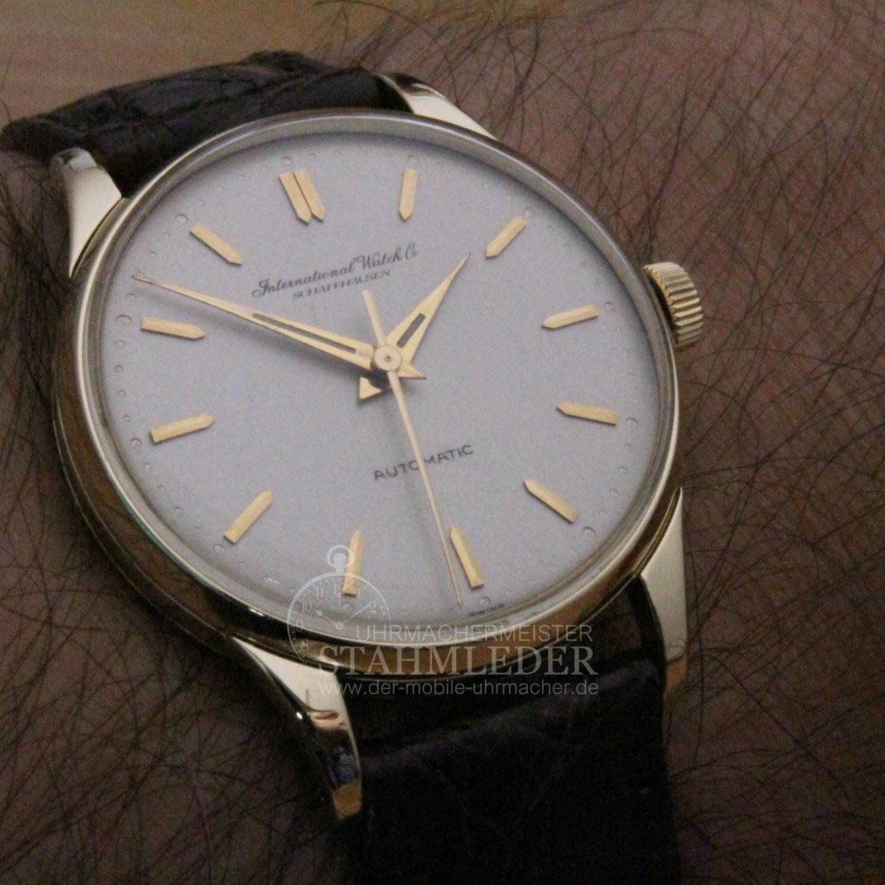 Zum Verkauf steht eine IWC Ingeneur in 585Gelbgold aus dem Jahre 1952. Im Inneren verrichtet das IWC Cal.852 seinen Dienst. Die IWC mit dem bekannten Pellatonaufzug = automatischer Aufzug entwickelt vom Chefing. bei IWC Albert Pellaton. Die Uhr wurde von mir grundüberholt und erhält damit eine 12 monatige Funktionsgarantie. Bei der Grundüberholung werden nur Originalersatzteile verwendet. Auch nach dem Kauf bin ich für Sie da wenn es Unklarheiten geben sollte oder nach einigen Jahren zum Service Ihrer Uhren. Sie möchten auch eine Bilderserie von Ihrer Uhr – kein Problem. Bei der nächsten Wartung Ihrer Uhr kann ich das machen. Dazu senden Sie Ihre Uhr an T.Stahmleder, Friedrich-Ebert-Damm 85D, 22047 Hamburg, meine Berufsbezeichnung auf der Sendung bitte weglassen aus Sicherheitsgründen. Dann erstelle ich Ihnen einen Kostenvoranschlag kostenfrei, Portokosten tragen Sie. Die Echtheit der Uhr wird durch die beigefügten Bilder dokumentiert. Alle hier eingestellten Fotos stammen von dieser angebotenen Uhr. Zum Teil sind die Bilder beim Zerlegen der Uhr gemacht worden vor der Reinigung. Oxydationen und Verunreinigungen sind nach dem Reinigen nicht mehr vorhanden. Alle innerhalb des Angebotes genannten und ggf. durch Dritte geschützten Marken-und Warenzeichen unterliegen uneingeschränkten Bestimmungen des jeweils gültigen Kennzeichenrechts und den Besitzrechten der jeweiligen eingetragenen Eigentümer. Allein aufgrund der bloßen Nennung ist nicht der Schluss zu ziehen, dass Markenzeichen nicht durch Rechte Dritter geschützt sind. Das Copyright für veröffentlichte, von UMM T.Stahmleder, selbst erstellte Objekte bleibt allein bei UMM T.Stahmleder. Eine Vervielfältigung oder Verwendung der Bilder und Texte in anderen elektronischen oder gedruckten Publikationen ist nur mit schriftlicher Zustimmung gestattet. Grundsätzliches: Bei der Reparatur von älteren Uhren ist zu beachten !!! Gerade bei älteren Uhren ist besondere Sorgfalt und Aufwand bei der Reparatur nötig, aber trotz dieser Sorgfalt kann man gewisse Eigenschaften der Uhr nicht immer in den Neuzustand zurücksetzen. Dazu gehören z.B. bei verschlissenen Gehäuse/die Wasserdichtigkeit. Daher grundsätzlich kein Duschen + kein Baden !!!