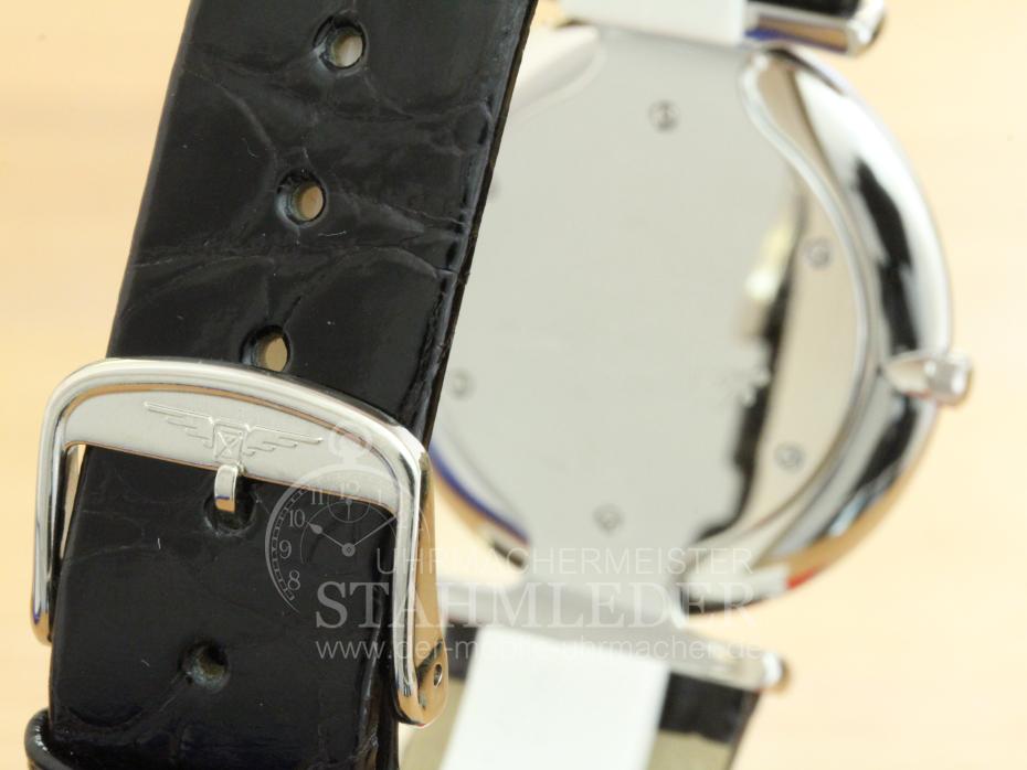 Zum Verkauf steht eine klassische und elegante Longines Damenuhr mit 64 Brillanten und neuem Krokoband. Mit der Größe von 33mm liegt sie im aktuellen Trend der "großen Damenuhren". Longines ist seit vielen Jahren bekannt für Qualität und Langlebigkeit. Bei der von mir durchgeführten Grundüberholung wurden nur Originalersatzteile verwendet. Das Aufarbeiten des Gehäuse ist Bestandteil der Grundüberholung. Die Bedienung/Zeigerstellung erfolgt recht einfach über die Krone bei „3 Uhr“. Auch nach dem Kauf bin ich für Sie da wenn es Unklarheiten geben sollte oder nach einigen Jahren zum Service Ihrer Uhren. Sie möchten auch eine Bilderserie von Ihrer Uhr – kein Problem. Bei der nächsten Wartung Ihrer Uhr kann ich das machen. Dazu senden Sie Ihre Uhr an T.Stahmleder, Friedrich-Ebert-Damm 85D, 22047 Hamburg, meine Berufsbezeichnung auf der Sendung bitte weglassen aus Sicherheitsgründen. Dann erstelle ich Ihnen einen Kostenvoranschlag kostenfrei, Portokosten tragen Sie. Die Echtheit der Uhr wird durch die beigefügten Bilder und das Echtheitszertifikat vom Hersteller Longines dokumentiert. Alle hier eingestellten Fotos stammen von dieser angebotenen Uhr. Zum Teil sind die Bilder beim Zerlegen der Uhr gemacht worden vor der Reinigung. Oxydationen und Verunreinigungen sind nach dem Reinigen nicht mehr vorhanden. Alle innerhalb des Angebotes genannten und ggf. durch Dritte geschützten Marken-und Warenzeichen unterliegen uneingeschränkten Bestimmungen des jeweils gültigen Kennzeichenrechts und den Besitzrechten der jeweiligen eingetragenen Eigentümer. Allein aufgrund der bloßen Nennung ist nicht der Schluss zu ziehen, dass Markenzeichen nicht durch Rechte Dritter geschützt sind. Das Copyright für veröffentlichte, von UMM T.Stahmleder, selbst erstellte Objekte bleibt allein bei UMM T.Stahmleder. Eine Vervielfältigung oder Verwendung der Bilder und Texte in anderen elektronischen oder gedruckten Publikationen ist nur mit schriftlicher Zustimmung gestattet. Der Käufer erhält eine 12-monatige Funktionsgarantie. Die gesetzlichen Gewährleistungsrechte bleiben unberührt. Mit der Garantie wird gewährleistet, dass die Uhr keine Funktionsmängel aufweist. Die Dauer beschränkt sich auf ein Jahr. Der Garantieanspruch ist schriftlich unter Vorlage des Kaufbeleges geltend zu machen. Der Garantieanspruch ist ausgeschlossen, wenn die Uhr durch eigenes Verschulden beschädigt bzw. zerstört wurde. Die Garantie umfasst nicht das Glas, sowie das Armband. Garantiegeber ist der Verkäufer, für die Inanspruchnahme hat sich der Käufer an folgende Adresse zu wenden. Die EU-Kommission hat eine Internetplattform zur Online-Beilegung von Streitigkeiten ( sog. "OS-Plattform ) geschaffen. Die OD-Plattformdient als Anlaufstelle zur außergerichtlichen Beilegung von Streitigkeiten betreffend vertragliche Verpflichtungen, die aus Online-Kaufverträgen erwachsen. Der Kunde kann die OS-Plattform unter dem folgenden Link errreichen:http://ec.europa.eu/consumers/odr Grundsätzliches: Bei der Reparatur von älteren Uhren ist zu beachten !!! Gerade bei älteren Uhren ist besondere Sorgfalt und Aufwand bei der Reparatur nötig, aber trotz dieser Sorgfalt kann man gewisse Eigenschaften der Uhr nicht immer in den Neuzustand zurücksetzen. Dazu gehören z.B. bei verschlissenen Gehäuse/die Wasserdichtigkeit. Daher grundsätzlich kein Duschen + kein Baden !!! Mit Abgabe eines Gebotes auf dieses Angebot erkennen Sie diese Bedingungen an. |