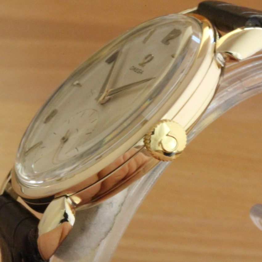 Zum Verkauf steht eine klassische Omega Herrenuhr mit Handaufzug aus dem Jahre 1952. Das dreiteilige vergoldetet Gehäuse mit seiner sehr starken Vergoldung von 80 Mikron befindet sich in einem sehr guten Zustand. Mit seinen 35 mm Durchmesser ist die Omega recht groß für die damalige Zeit und durch die Genfer Bandanstöße wird dieser Eindruck noch verstärkt, 42,5mm über die Bandanstöße gemessen. Im Inneren verrichtet das solide Omega Cal.266 seinen Dienst. Es wurde von 1939 bis 1963 in verschiedenen Varianten gebaut. Die Omega besitz eine versenkte kleine Sekundenanzeige bei "6 Uhr". Sie möchten auch eine Bilderserie von Ihrer Uhr – kein Problem. Bei der nächsten Wartung Ihrer Uhr kann ich das machen. Dazu senden Sie Ihre Uhr an T.Stahmleder, Friedrich-Ebert-Damm 85D, 22047 Hamburg, meine Berufsbezeichnung auf der Sendung bitte weglassen aus Sicherheitsgründen. Dann erstelle ich Ihnen einen Kostenvoranschlag kostenfrei, Portokosten tragen Sie. Die Echtheit der Uhr wird durch die beigefügten Bilder dokumentiert. Alle hier eingestellten Fotos stammen von dieser angebotenen Uhr. Zum Teil sind die Bilder beim Zerlegen der Uhr gemacht worden vor der Reinigung. Oxydationen und Verunreinigungen sind nach dem Reinigen nicht mehr vorhanden. Alle innerhalb des Angebotes genannten und ggf. durch Dritte geschützten Marken-und Warenzeichen unterliegen uneingeschränkten Bestimmungen des jeweils gültigen Kennzeichenrechts und den Besitzrechten der jeweiligen eingetragenen Eigentümer. Allein aufgrund der bloßen Nennung ist nicht der Schluss zu ziehen, dass Markenzeichen nicht durch Rechte Dritter geschützt sind. Das Copyright für veröffentlichte, von UMM T.Stahmleder, selbst erstellte Objekte bleibt allein bei UMM T.Stahmleder. Eine Vervielfältigung oder Verwendung der Bilder und Texte in anderen elektronischen oder gedruckten Publikationen ist nur mit schriftlicher Zustimmung gestattet. Grundsätzliches: Bei der Reparatur von älteren Uhren ist zu beachten !!! Gerade bei älteren Uhren ist besondere Sorgfalt und Aufwand bei der Reparatur nötig, aber trotz dieser Sorgfalt kann man gewisse Eigenschaften der Uhr nicht immer in den Neuzustand zurücksetzen. Dazu gehören z.B. bei verschlissenen Gehäuse/die Wasserdichtigkeit. Daher grundsätzlich kein Duschen + kein Baden !!!