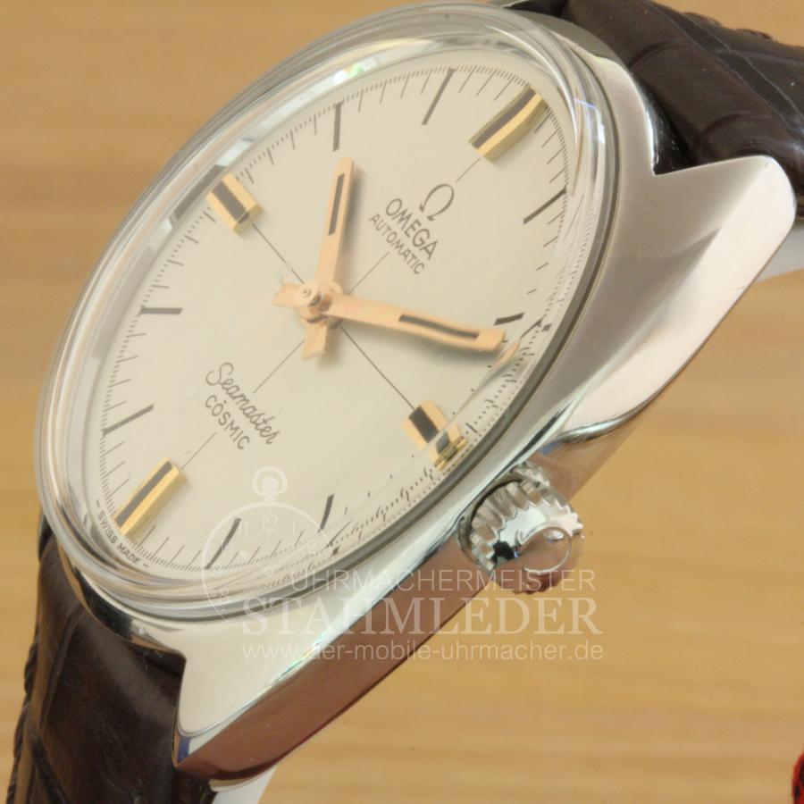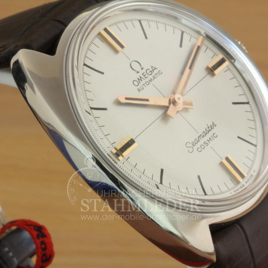 Zum Verkauf steht eine klassische Omega Seamaster Cosmic Herrenuhr Automat aus dem Jahre 1967. Im Inneren verrichtet das solide Omega Cal.552 seinen Dienst. Es wurde von 1958 bis 1969 gebaut. Die Omega hat eine Sekundenanzeige im Centrum, Zentralsekunde. Der Sekundenzeiger ist auf einigen Bildern nicht zu sehen, das hängt mit den langen Belichtungszeiten beim Fotographieren zusammen. Eine Uhr mit Unicoc Gehäuse aus einem Stück ist superdicht gegen Staub und Wasser (Neuzustand) und kann nur durch entfernen des Glases mit einem Spezialabheber geöffnet werden. Sie möchten auch eine Bilderserie von Ihrer Uhr – kein Problem. Bei der nächsten Wartung Ihrer Uhr kann ich das machen. Dazu senden Sie Ihre Uhr an T.Stahmleder, Friedrich-Ebert-Damm 85D, 22047 Hamburg, meine Berufsbezeichnung auf der Sendung bitte weglassen aus Sicherheitsgründen. Dann erstelle ich Ihnen einen Kostenvoranschlag kostenfrei, Portokosten tragen Sie. Die Echtheit der Uhr wird durch die beigefügten Bilder dokumentiert. Alle hier eingestellten Fotos stammen von dieser angebotenen Uhr. Zum Teil sind die Bilder beim Zerlegen der Uhr gemacht worden vor der Reinigung. Oxydationen und Verunreinigungen sind nach dem Reinigen nicht mehr vorhanden. Alle innerhalb des Angebotes genannten und ggf. durch Dritte geschützten Marken-und Warenzeichen unterliegen uneingeschränkten Bestimmungen des jeweils gültigen Kennzeichenrechts und den Besitzrechten der jeweiligen eingetragenen Eigentümer. Allein aufgrund der bloßen Nennung ist nicht der Schluss zu ziehen, dass Markenzeichen nicht durch Rechte Dritter geschützt sind. Das Copyright für veröffentlichte, von UMM T.Stahmleder, selbst erstellte Objekte bleibt allein bei UMM T.Stahmleder. Eine Vervielfältigung oder Verwendung der Bilder und Texte in anderen elektronischen oder gedruckten Publikationen ist nur mit schriftlicher Zustimmung gestattet. Grundsätzliches: Bei der Reparatur von älteren Uhren ist zu beachten !!! Gerade bei älteren Uhren ist besondere Sorgfalt und Aufwand bei der Reparatur nötig, aber trotz dieser Sorgfalt kann man gewisse Eigenschaften der Uhr nicht immer in den Neuzustand zurücksetzen. Dazu gehören z.B. bei verschlissenen Gehäuse/die Wasserdichtigkeit. Daher grundsätzlich kein Duschen + kein Baden !!!