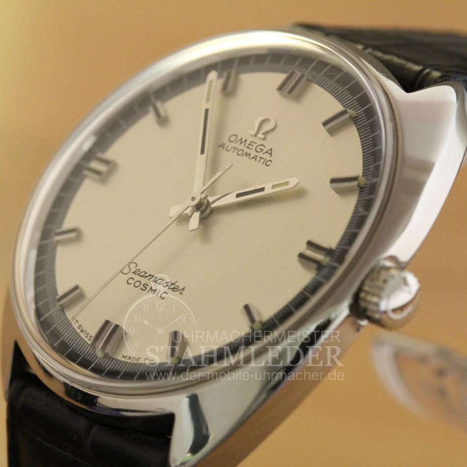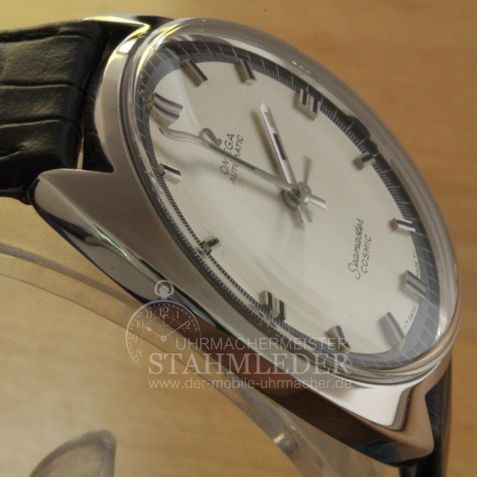 Zum Verkauf steht eine klassische Omega Seamaster Cosmic Herrenuhr Automat aus dem Jahre 1968. Im Inneren verrichtet das solide Omega Cal.552 seinen Dienst. Es wurde von 1958 bis 1969 gebaut. Die Omega hat eine Sekundenanzeige im Centrum, Zentralsekunde. Eine Uhr mit Unicoc Gehäuse aus einem Stück ist superdicht gegen Staub und Wasser (Neuzustand) und kann nur durch entfernen des Glases mit einem Spezialabheber geöffnet werden. Sie möchten auch eine Bilderserie von Ihrer Uhr – kein Problem. Bei der nächsten Wartung Ihrer Uhr kann ich das machen. Dazu senden Sie Ihre Uhr an T.Stahmleder, Friedrich-Ebert-Damm 85D, 22047 Hamburg, meine Berufsbezeichnung auf der Sendung bitte weglassen aus Sicherheitsgründen. Dann erstelle ich Ihnen einen Kostenvoranschlag kostenfrei, Portokosten tragen Sie. Die Echtheit der Uhr wird durch die beigefügten Bilder dokumentiert. Alle hier eingestellten Fotos stammen von dieser angebotenen Uhr. Zum Teil sind die Bilder beim Zerlegen der Uhr gemacht worden vor der Reinigung. Oxydationen und Verunreinigungen sind nach dem Reinigen nicht mehr vorhanden. Alle innerhalb des Angebotes genannten und ggf. durch Dritte geschützten Marken-und Warenzeichen unterliegen uneingeschränkten Bestimmungen des jeweils gültigen Kennzeichenrechts und den Besitzrechten der jeweiligen eingetragenen Eigentümer. Allein aufgrund der bloßen Nennung ist nicht der Schluss zu ziehen, dass Markenzeichen nicht durch Rechte Dritter geschützt sind. Das Copyright für veröffentlichte, von UMM T.Stahmleder, selbst erstellte Objekte bleibt allein bei UMM T.Stahmleder. Eine Vervielfältigung oder Verwendung der Bilder und Texte in anderen elektronischen oder gedruckten Publikationen ist nur mit schriftlicher Zustimmung gestattet. Grundsätzliches: Bei der Reparatur von älteren Uhren ist zu beachten !!! Gerade bei älteren Uhren ist besondere Sorgfalt und Aufwand bei der Reparatur nötig, aber trotz dieser Sorgfalt kann man gewisse Eigenschaften der Uhr nicht immer in den Neuzustand zurücksetzen. Dazu gehören z.B. bei verschlissenen Gehäuse/die Wasserdichtigkeit. Daher grundsätzlich kein Duschen + kein Baden !!!