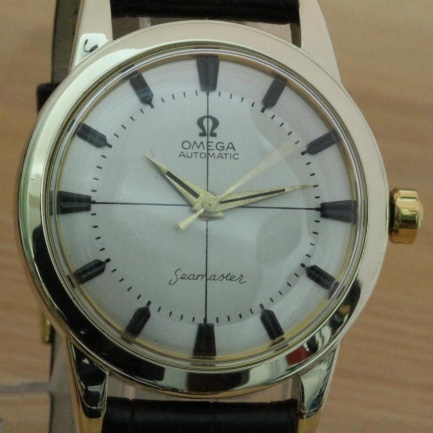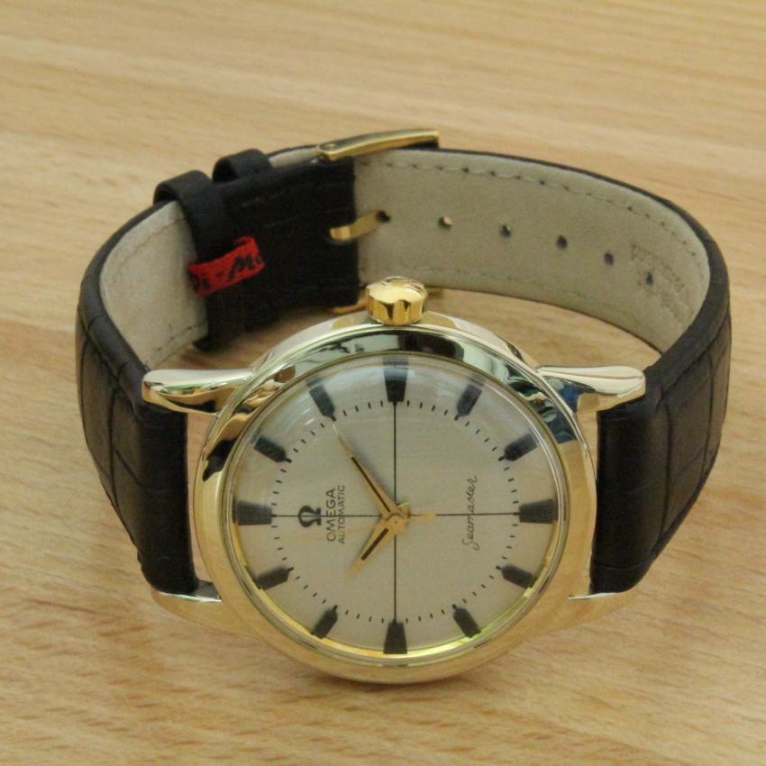 Zum Verkauf steht eine klassische Omega Seamaster Herrenautomatikuhr aus dem Jahre 1953. Das Gehäuse besteht aus 14kt Gelbgold. Im Inneren verrichtet das solide Omega Hammerautomaik Cal.354 seinen Dienst. Es wurde von 1952 bis 1955 gebaut. Der Gesamtzustand der Uhr ist sehr gut, der Uhr ist ihr Alter kaum anzusehen.