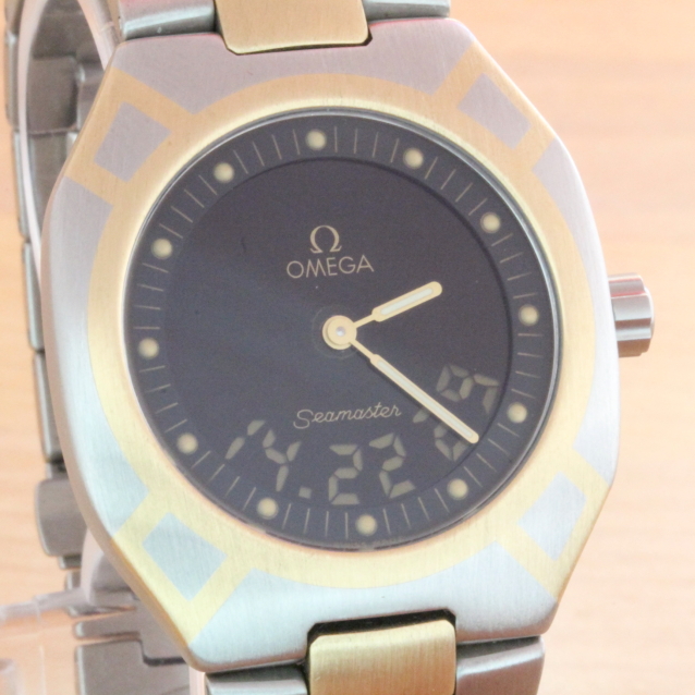 Zum Verkauf steht eine Omega Seamaster Polaris Herrenuhr in Stahl/Gold mit Stahl/Goldband. Gold = Goldeinlagen 18ct = 750GG. Es handelt sich um eine Quatz-Multifunktionsuhr mit Hybridanzeige. Diese Uhr sieht nicht nur elegant und sportlich aus sondern sie ist es auch. Die Uhr mit den acht Gesichtern und der magischen Krone, bei der es genügt die Krone vor-oder rückwärts zu drehen um eine der acht programmierbaren Anzeigen abzurufen. Einfache und permanente analog-Zeitanzeige von Stunden und Minuten und zusätzlich auf der mysteriösen LCD Anzeige die Digitalangaben der Uhrzeit, ewiger Kalender, rückwärtslaufender Zähler, zweite Zeitzone, Alarm/Wecker und 100stel-Sekunden Digital Chronograph. Diese Modell wurde ab 1988 so wie angeboten gebaut. Die Uhr wurde von mir grundüberholt, in diesem Fall ein kompletter Werktausch vorgenommen, und erhält damit eine 12 monatige Funktionsgarantie. Bei der Grundüberholung werden nur Originalersatzteile verwendet. Das Aufarbeiten des Gehäuse und des Bandes ist ebenfalls Bestandteil der Grundüberholung. Die Bedienung erfolgt über die magische Krone. Auch nach dem Kauf bin ich für Sie da wenn es Unklarheiten geben sollte oder nach einigen Jahren zum Service Ihrer Uhren. Sie möchten auch eine Bilderserie von Ihrer Uhr – kein Problem. Bei der nächsten Wartung Ihrer Uhr kann ich das machen. Dazu senden Sie Ihre Uhr an T.Stahmleder, Friedrich-Ebert-Damm 85D, 22047 Hamburg, meine Berufsbezeichnung auf der Sendung bitte weglassen aus Sicherheitsgründen. Dann erstelle ich Ihnen einen Kostenvoranschlag kostenfrei, Portokosten tragen Sie. Die Echtheit der Uhr wird durch die beigefügten Bilder dokumentiert. Alle hier eingestellten Fotos stammen von dieser angebotenen Uhr. Zum Teil sind die Bilder beim Zerlegen der Uhr gemacht worden vor der Reinigung. Oxydationen und Verunreinigungen sind nach dem Reinigen nicht mehr vorhanden. Alle innerhalb des Angebotes genannten und ggf. durch Dritte geschützten Marken-und Warenzeichen unterliegen uneingeschränkten Bestimmungen des jeweils gültigen Kennzeichenrechts und den Besitzrechten der jeweiligen eingetragenen Eigentümer. Allein aufgrund der bloßen Nennung ist nicht der Schluss zu ziehen, dass Markenzeichen nicht durch Rechte Dritter geschützt sind. Das Copyright für veröffentlichte, von UMM T.Stahmleder, selbst erstellte Objekte bleibt allein bei UMM T.Stahmleder. Eine Vervielfältigung oder Verwendung der Bilder und Texte in anderen elektronischen oder gedruckten Publikationen ist nur mit schriftlicher Zustimmung gestattet. Grundsätzliches: Bei der Reparatur von älteren Uhren ist zu beachten !!! Gerade bei älteren Uhren ist besondere Sorgfalt und Aufwand bei der Reparatur nötig, aber trotz dieser Sorgfalt kann man gewisse Eigenschaften der Uhr nicht immer in den Neuzustand zurücksetzen.