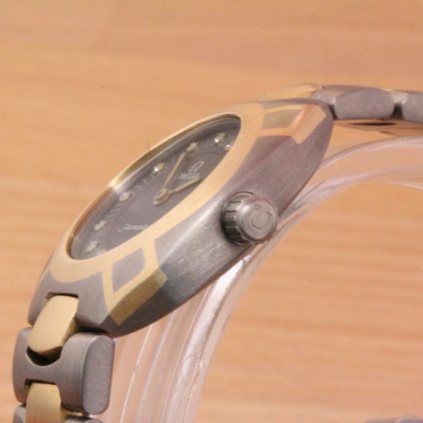 Zum Verkauf steht eine zeitlos, schöne Omega Seamaster Polaris Damenuhr aus dem Jahre 1984 im Titangehäuse mit 18kt Goldeinlagen und Brilliantzifferblatt. Das Band besteht ebenfalls aus Titan mit massiven 18kt Goldelementen. Im Inneren verrichtet das solide Omega Quarzcal.1450 seinen Dienst. Der Gesamtzustand der Uhr ist sehr gut.