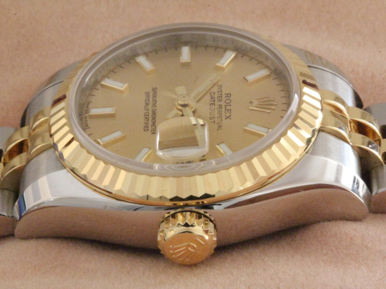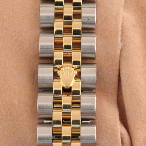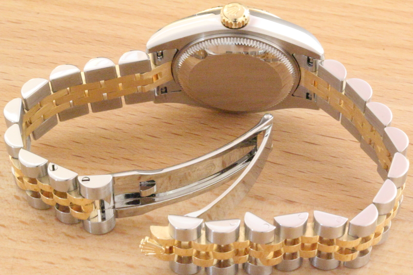 Zum Verkauf steht eine klassische Rolex Damemuhr Datejust in Stahl/Gold aus dem Jahre 2012 mit Kalenderschaltung. Das Gehäuse besteht aus Edelstahl. Das Saphierglas ist mit einer 18kt geriffelten Goldlünette umfaßt. Das fünfreihige Jubilèband ist in einem absolut neuwertigen Zustand. Diese Uhr wurde als "gute Uhr" nur zu besonderen Anlässen getragen. Daher auch der perfekte neuwertige Zustand des Gehäuses und des Uhrwerkes. |