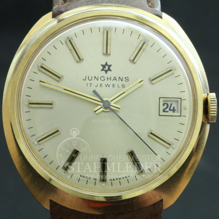 Zum Verkauf steht eine klassische Junghans Herrenuhr mit Handaufzug aus der Mitte der 70ger Jahren mit Kalender inkl. eines kompletten Unterhaltsdienstes. Dieses typische 70iger Jahre Gehäuse ist vergoldet. Im Inneren verrichtet das Junghans Cal.623.20 seinen Dienst. Es gehört zur letzten Mechanik-Familie von Junghans und wurde von 1974 bis 1976 gebaut. Die Junghans hat eine Sekundenanzeige im Centrum und eine Schnellschaltung für den Kalender. Wie immer bei mechanischen Uhren die Schnellschaltung nicht zwischen 21 und 6 Uhr benutzen !! Der Käufer erhält eine 12-monatige Funktionsgarantie. Die gesetzlichen Gewährleistungsrechte bleiben unberührt. Mit der Garantie wird gewährleistet, dass die Uhr keine Funktionsmängel aufweist. Die Dauer beschränkt sich auf ein Jahr. Der Garantieanspruch ist schriftlich unter Vorlage des Kaufbeleges geltend zu machen. Der Garantieanspruch ist ausgeschlossen, wenn die Uhr durch eigenes Verschulden beschädigt bzw. zerstört wurde. Die Garantie umfasst nicht das Glas, sowie das Armband. Garantiegeber ist der Verkäufer, für die Inanspruchnahme hat sich der Käufer an folgende Adresse zu wenden. Die EU-Kommission hat eine Internetplattform zur Online-Beilegung von Streitigkeiten ( sog. "OS-Plattform ) geschaffen. Die OD-Plattformdient als Anlaufstelle zur außergerichtlichen Beilegung von Streitigkeiten betreffend vertragliche Verpflichtungen, die aus Online-Kaufverträgen erwachsen. Der Kunde kann die OS-Plattform unter dem folgenden Link errreichen:http://ec.europa.eu/consumers/odr