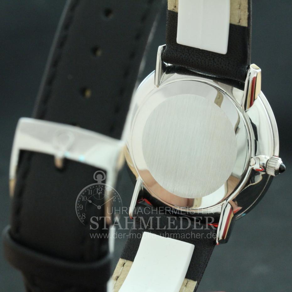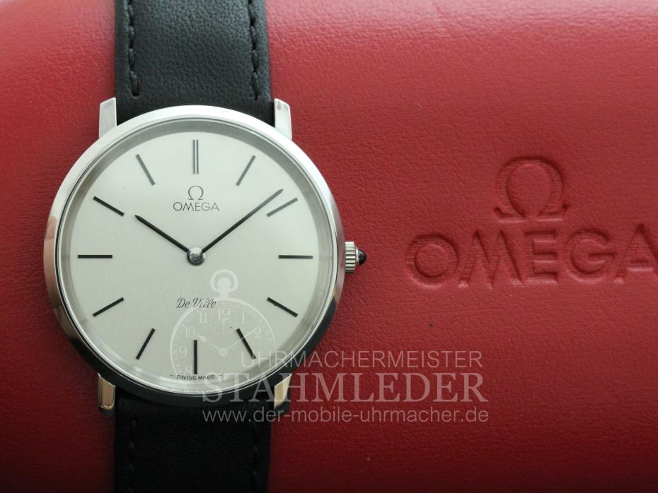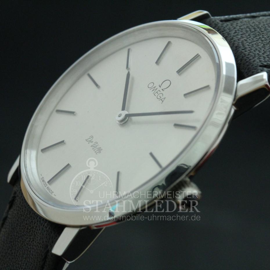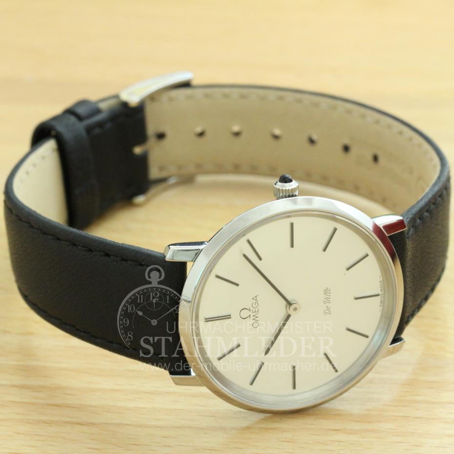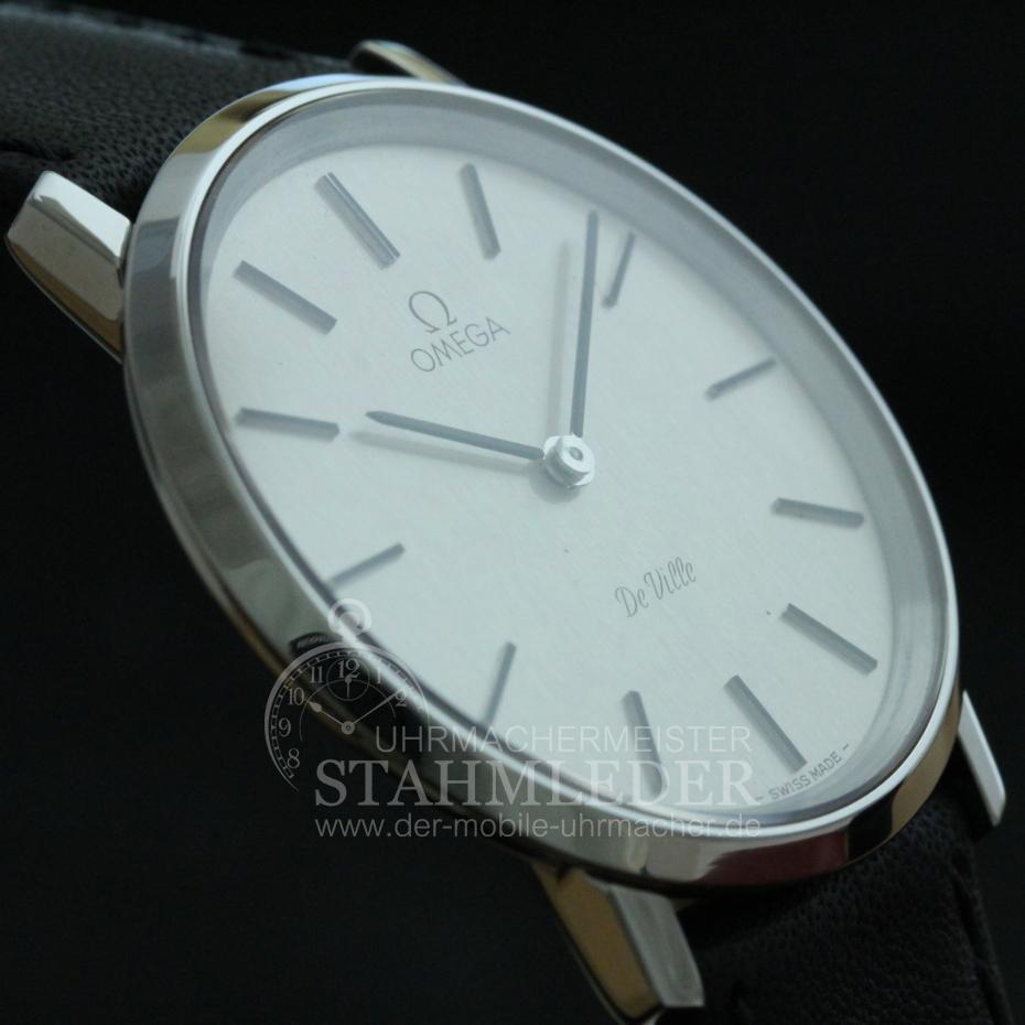 Zum Verkauf steht eine klassische Omega DeVille in Stahl mit Handaufzug inkl. eines kompletten Wartungsdienstes. Ein Klassiker in Form und Design. Durch das schlichte, edle Design ist eine gute Ablesbarkeit garantiert. Durch die sehr geringe Gesamthöhe von nur 6,5mm schmiegt sich die DeVille auch an zierliche Handgelenke gut an. Omega ist seit vielen Jahren bekannt für Qualität und Langlebigkeit. Bei der Grundüberholung wurden nur Originalersatzteile verwendet. Das Aufarbeiten des Gehäuse sowie ein neues, schwarzes Lederband mit matter Oberfläche und einer Omega-Dornenschließe in Stahl sind inklusivie. Im Inneren verrichtet das solide Omega Cal.620 seinen Dienst. Dieses Uhrwerk wurde von 1960 bis 1973 gebaut. Der Gesamtzustand der Uhr ist sehr gut. |