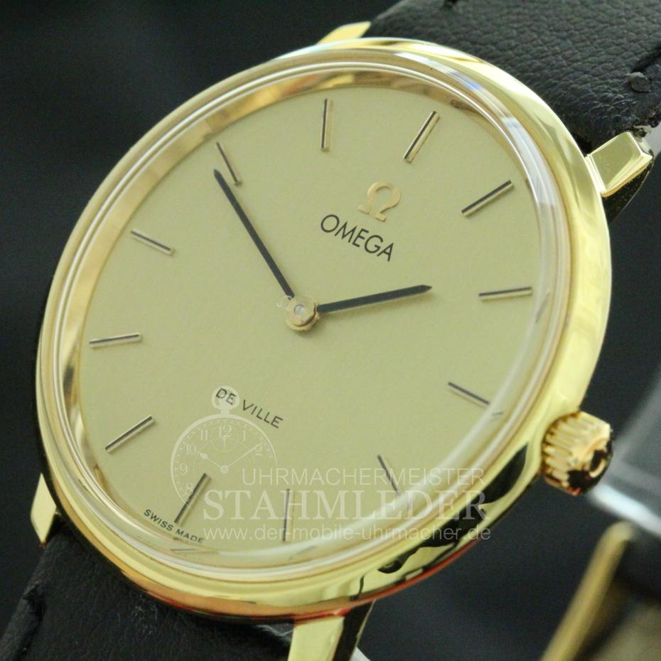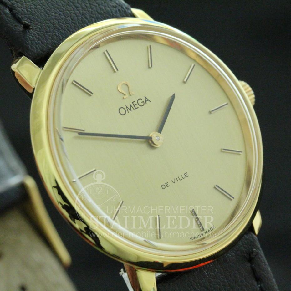 Zum Verkauf steht eine klassische Omega DeVille mit Handaufzug inkl. eines kompletten Wartungsdienstes. Ein Klassiker in Form und Design. Durch das schlichte, edle Design ist eine gute Ablesbarkeit garantiert. Durch die sehr geringe Gesamthöhe von nur 7,5mm schmiegt sich die DeVille auch an zierliche Handgelenke gut an. Omega ist seit vielen Jahren bekannt für Qualität und Langlebigkeit. Bei der Grundüberholung wurden nur Originalersatzteile verwendet. Das Aufarbeiten des Gehäuse sowie ein neues, Lederband mit matter Oberfläche und einer vergoldeten Omega-Dornenschließe sind inklusivie. Im Inneren verrichtet das solide Omega Cal.620 seinen Dienst. Dieses Uhrwerk wurde von 1960 bis 1973 gebaut. Der Gesamtzustand der Uhr ist sehr gut. |