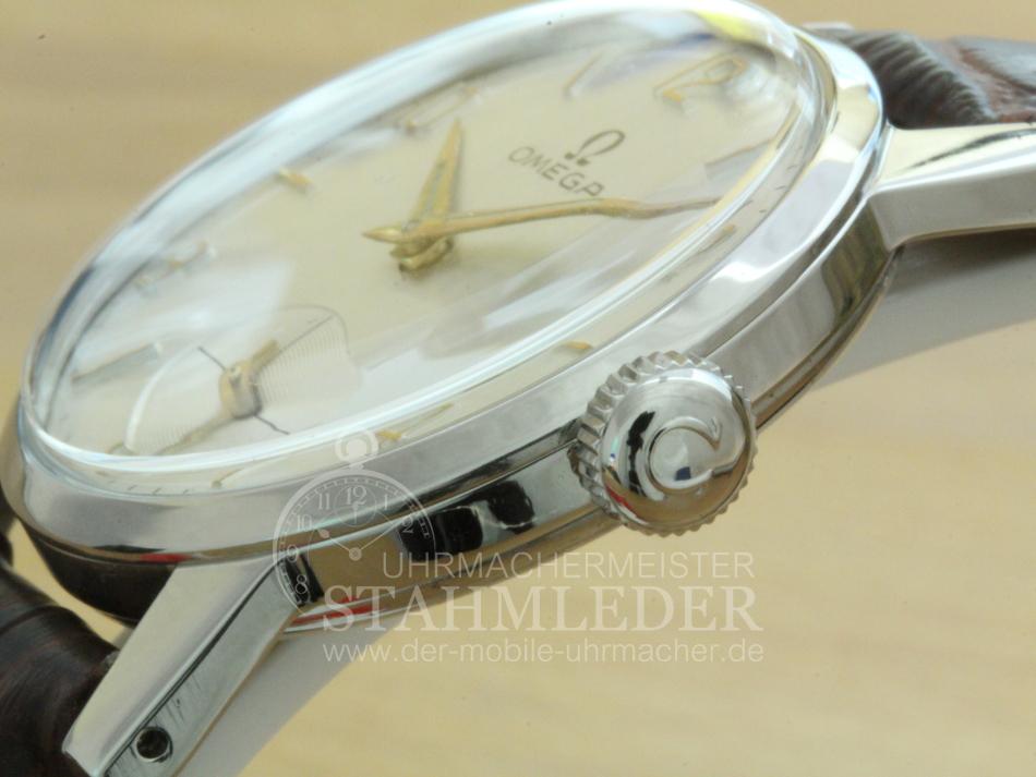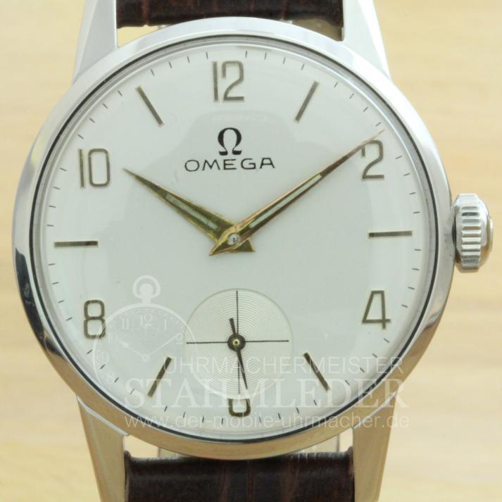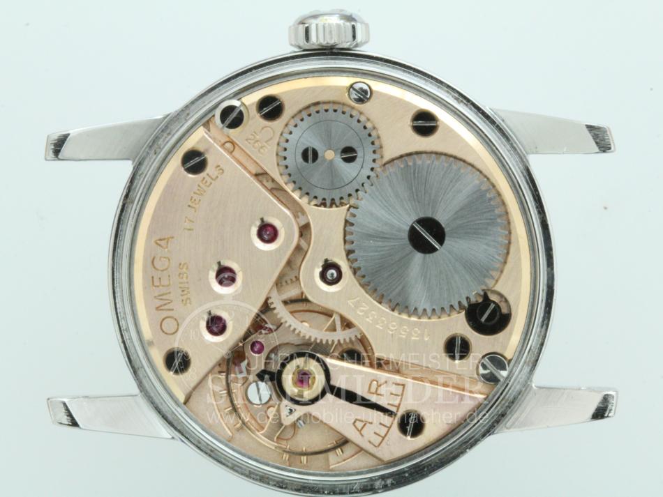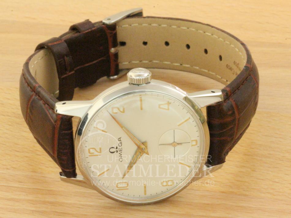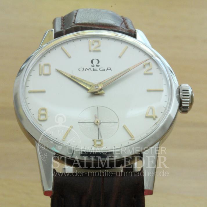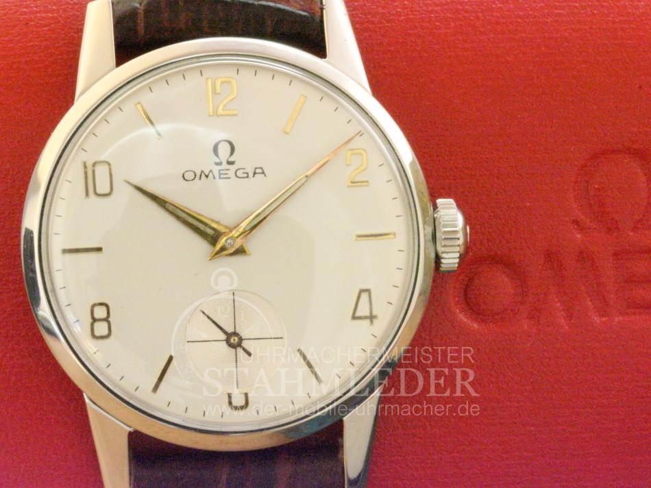 Zum Verkauf steht eine klassische Omega Herrenuhr mit Handaufzug aus dem Jahre 1952. Das dreiteilige Stahlgehäuse befindet sich in einem sehr guten Zustand. Im Inneren verrichtet das solide Omega Cal.266 seinen Dienst. Es wurde von 1939 bis 1963 in verschiedenen Varianten gebaut. Die Omega besitzt eine versenkte kleine Sekundenanzeige bei "6 Uhr". Sie möchten auch eine Bilderserie von Ihrer Uhr – kein Problem. Bei der nächsten Wartung Ihrer Uhr kann ich das machen. Dazu senden Sie Ihre Uhr an T.Stahmleder, Friedrich-Ebert-Damm 85D, 22047 Hamburg, meine Berufsbezeichnung auf der Sendung bitte weglassen aus Sicherheitsgründen. Dann erstelle ich Ihnen einen Kostenvoranschlag kostenfrei, Portokosten tragen Sie. Die Echtheit der Uhr wird durch die beigefügten Bilder dokumentiert. Alle hier eingestellten Fotos stammen von dieser angebotenen Uhr. Zum Teil sind die Bilder beim Zerlegen der Uhr gemacht worden vor der Reinigung. Oxydationen und Verunreinigungen sind nach dem Reinigen nicht mehr vorhanden. Alle innerhalb des Angebotes genannten und ggf. durch Dritte geschützten Marken-und Warenzeichen unterliegen uneingeschränkten Bestimmungen des jeweils gültigen Kennzeichenrechts und den Besitzrechten der jeweiligen eingetragenen Eigentümer. Allein aufgrund der bloßen Nennung ist nicht der Schluss zu ziehen, dass Markenzeichen nicht durch Rechte Dritter geschützt sind. Das Copyright für veröffentlichte, von UMM T.Stahmleder, selbst erstellte Objekte bleibt allein bei UMM T.Stahmleder. Eine Vervielfältigung oder Verwendung der Bilder und Texte in anderen elektronischen oder gedruckten Publikationen ist nur mit schriftlicher Zustimmung gestattet. Grundsätzliches: Bei der Reparatur von älteren Uhren ist zu beachten !!! Gerade bei älteren Uhren ist besondere Sorgfalt und Aufwand bei der Reparatur nötig, aber trotz dieser Sorgfalt kann man gewisse Eigenschaften der Uhr nicht immer in den Neuzustand zurücksetzen. Dazu gehören z.B. bei verschlissenen Gehäuse/die Wasserdichtigkeit. Daher grundsätzlich kein Duschen + kein Baden !!! Der Käufer erhält eine 12-monatige Funktionsgarantie. Die gesetzlichen Gewährleistungsrechte bleiben unberührt. Mit der Garantie wird gewährleistet, dass die Uhr keine Funktionsmängel aufweist. Die Dauer beschränkt sich auf ein Jahr. Der Garantieanspruch ist schriftlich unter Vorlage des Kaufbeleges geltend zu machen. Der Garantieanspruch ist ausgeschlossen, wenn die Uhr durch eigenes Verschulden beschädigt bzw. zerstört wurde. Die Garantie umfasst nicht das Glas, sowie das Armband. Garantiegeber ist der Verkäufer, für die Inanspruchnahme hat sich der Käufer an folgende Adresse zu wenden.