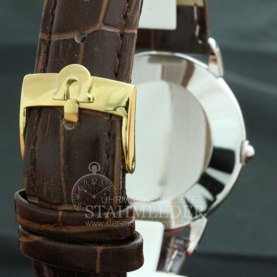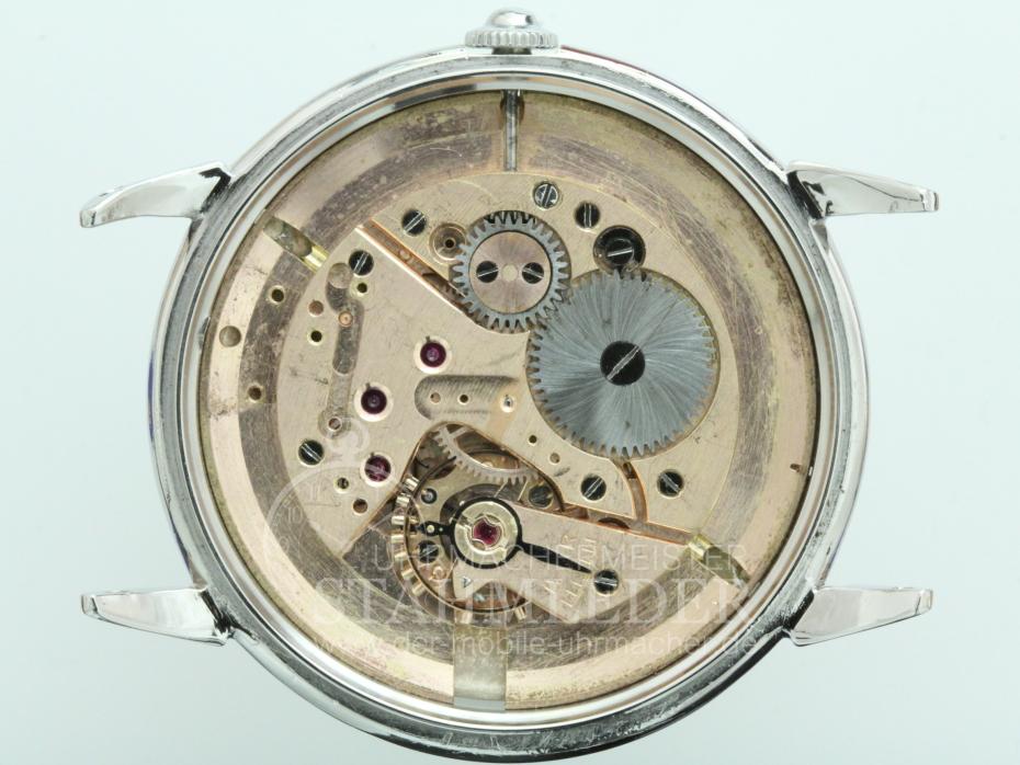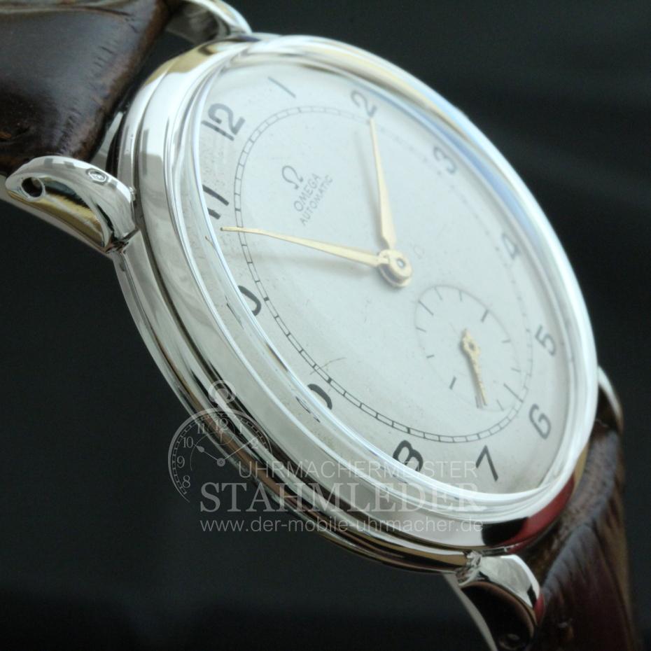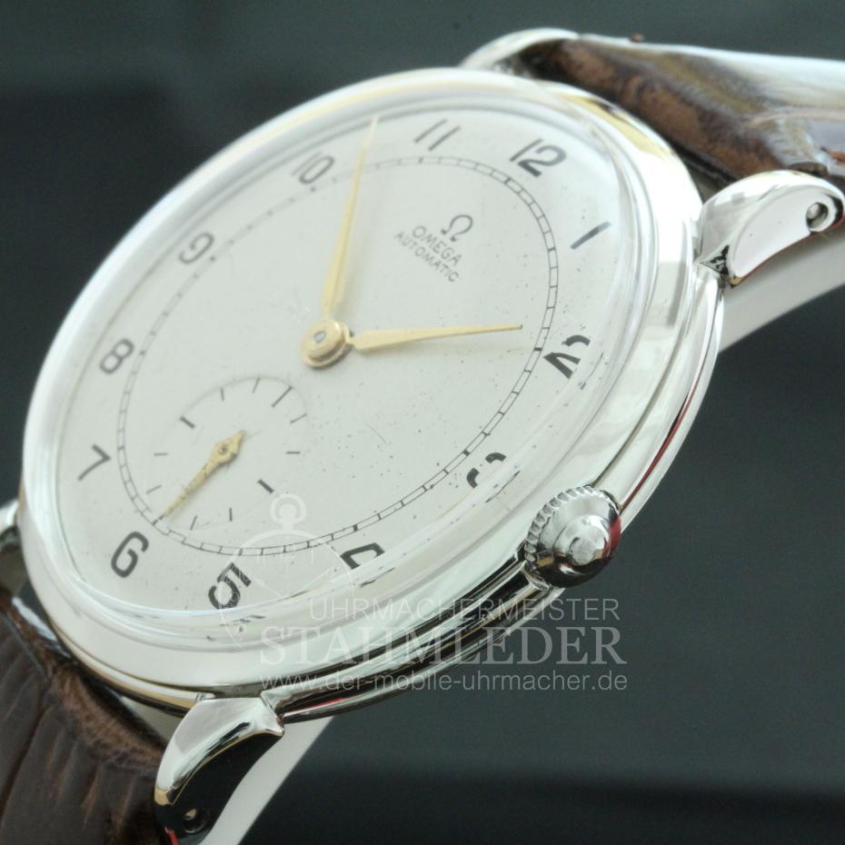 Zum Verkauf steht eine klassische Omega Herrenuhr in Stahl aus Mitte der 1940er Jahre inkl. eines kompletten Unterhaltssdienstes. Das dreiteilige Stahlgehäuse mit seinen 35mm Ø ist außergewöhnlich groß für diese Zeit. Im Inneren verrichtet das solide Omega Cal. 330/30.10. RA PC seinen Dienst. Es wurde von 1942 bis 1949 gebaut. Bei dem von mir durchgeführten Unterhaltsdienst wurden nur Originalteile verwendet. Die hier angebotene Omega wurde umgebaut. Ursprüngkich war diese eine Automatik. Die komplette Automatik wurde entnommen und das Federhaus hat einen Anschlag, für die erneuerte Zugfeder, bekommen.