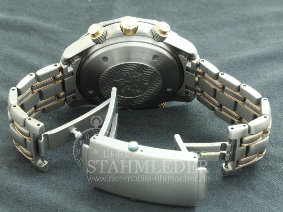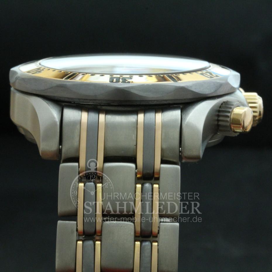 Zum Verkauf steht ein Omega Professional Chrono Diver aus dem Jahre 1986 inkl. eines kompletten Unterhaltsdienstes. Das dreiteilige Titan-Tantal-Rotgoldgehäuse und das integrierte Titan-Tantal-Rotgoldband wurden gereinigt und aufgearbeitet. Tantal ist ein silberfarbiges sehr schweres, hartes Metall und ist bei diesem Model bei der Lünette und bei den kleinen inneren Bandgliedern verwendet worden. Im Inneren verrichtet das solide Omega Automatik-Chronometer-Cal.1154 seinen Dienst. Dieser Diver erhielt 1994 die Auszeichnung " Uhr des Jahres 1994".