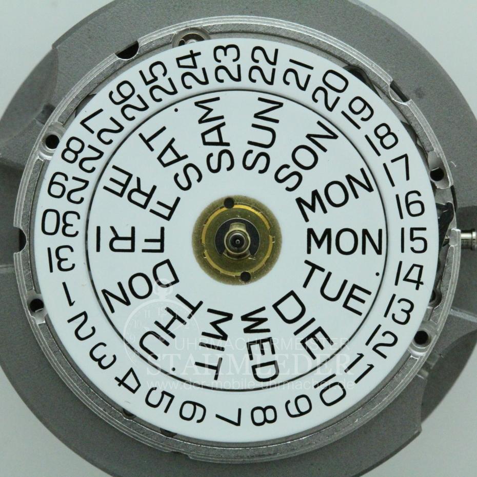 Die Kalendereinstellung funtioniert in der zweiten Rastung der Krone. Durch Drehen der Krone nach rechts, Richtung 12 Uhr, wird das Datum verstellt. Dreht man die Krone nach links kann der Wochentag einstellt werden. Bitte beachten !! Zwischen 20Uhr und 6Uhr die Schnellschaltung nicht bedienen !! Dies führt zu Schäden der Kalenderschaltung.